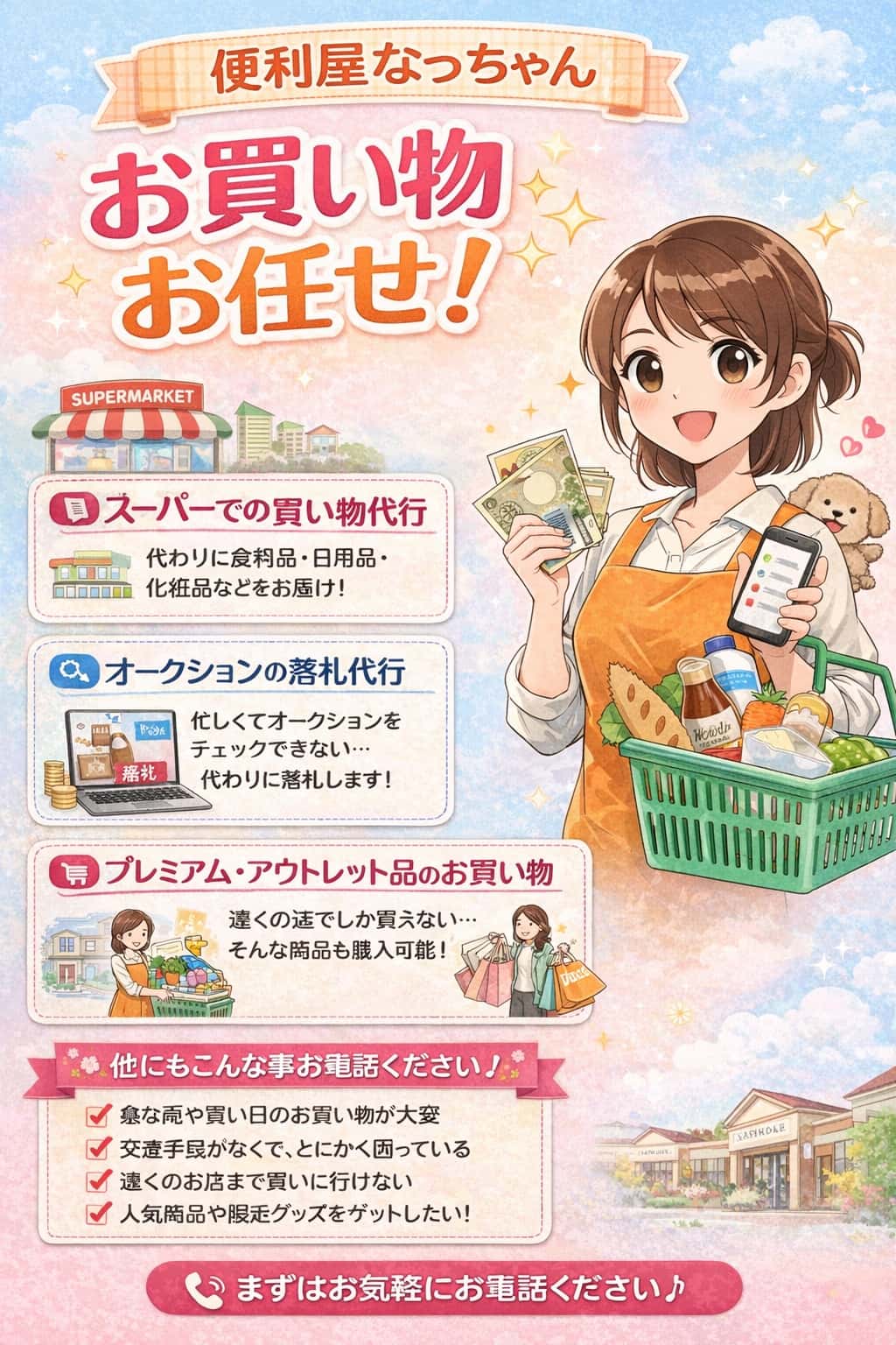 体調不良・ご高齢・お忙しい方のために、 日用品・食料品・代理購入を行います。